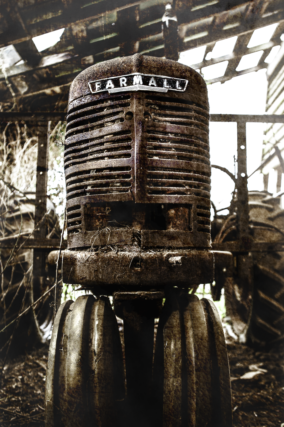 Old weathered barn with a rusted metal roof, surrounded by overgrown grass and trees, under a textured, vintage-style backdrop.